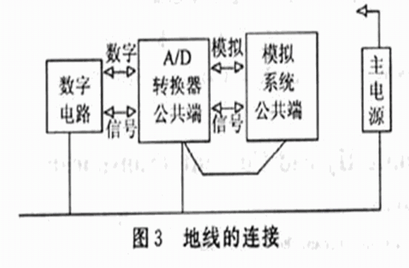 數字地線通常有很大的噪聲,而且有大的電流尖峰,所有的模擬公共地線應該和數字公共地線分開走線,然后只在一點匯集在一處,如圖3所示,這種接法使模擬和數字地線間的公共阻抗最小。