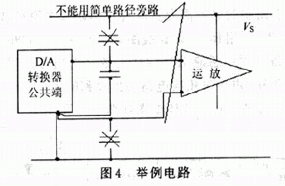 圖4說明這樣一種方法,他應用于模擬量輸出運算放大器對于數/模轉換器數字驅動噪聲的去耦,如果旁路電容隨意地直接接到電源的兩根母線之間,旁路電容起不到應有的作用,甚至可能有害,他從"不干凈"的到"清潔"的Vs,為噪聲提供低阻抗的交流通路。