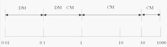 由于DC-DC轉換器的工作頻率基本都在幾百KHz,根據以往各型號產品的EMC檢測試驗經驗,一般情況下DC-DC轉換器的EMI超標頻段都會覆蓋0.1_1MHz頻段的一部分或全部范圍。根據圖1所示的分布原理,我們通常要采取有重點地對CM和DM同時抑制的原則。