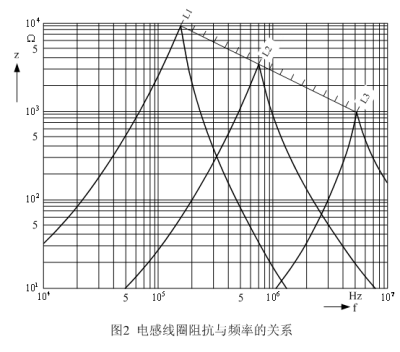 圖2是普通電感線圈的阻抗與頻率的關系圖,由圖中可以看出,電感線圈的阻抗開始的時候是隨著頻率升高而增大的,但當它的阻抗增大到最大值以后,阻抗反而隨著頻率升高而迅速下降,這是因為并聯分布電容的作用。當阻抗增到最大值的地方,就是電感線圈的分布電容與等效電感產生并聯諧振的地方。圖中,L1 > L2 > L3,由此可知電感線圈的電感量越大,其諧振頻率就越低。從圖2中可以看出,如果要對頻率為1MHz的干擾信號進行抑制,選用L1倒不如選用L3,因為L3的電感量要比L1小十幾倍,因此L3的成本也要比L1低很多。