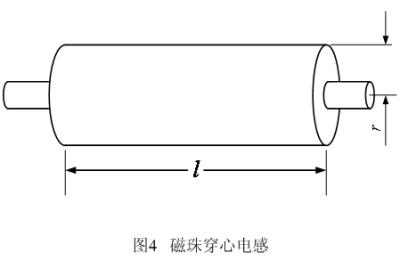 穿心電感的電感量一般都比較小,大約在幾微亨到幾十微亨之間,電感量大小與穿心電感中導線的大小以及長度,還有磁珠的截面積都有關系,但與磁珠電感量關系最大的還要算磁珠的相對導磁率 。圖3、圖4是分別是指導線和穿心電感的原理圖,計算穿心電感時,首先要計算一根圓截面直導線的電感,然后計算結果乘上磁珠相對導磁率 就可以求出穿心電感的電感量。