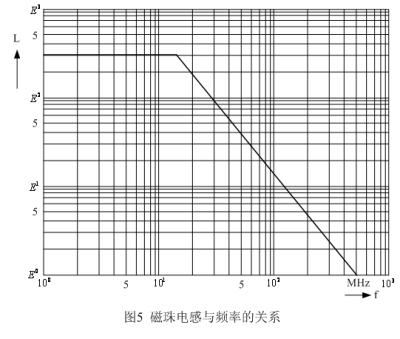 在低頻時,一般磁珠的相對導磁率  都很大(大于100),但在高頻時其有效導磁率 只有相對導磁率  的幾分之一,甚至幾十分之一。因此,磁珠也有截止頻率的問題,所謂截止頻率,就是使磁珠的有效導磁率 下降到接近1時的工作頻率fc,此時磁珠已經失去一個電感的作用。一般磁珠的截止頻率fc都在30~300MHz之間,截止頻率的高低與磁珠的材料有關,一般導磁率越高的磁芯材料,其截止頻率fc反而越低,因為低頻磁芯材料渦流損耗比較大。使用者在進行電路設計的時候,可要求磁芯材料的提供商提供磁芯工作頻率與有效導磁率 的測試數據,或穿心電感在不同工作頻率之下的曲線圖。圖5是穿心電感的頻率曲線圖。