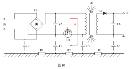 值得一提的是,開關電源變壓器初級線圈的漏感產生的反電動勢et,在所有干擾信號之中是最不容忽視的,如圖10所示。當電源開關管關斷的時候,開關電源變壓器初級線圈的漏感產生的反電動勢et幾乎沒有回路可釋放,一方面,它只能通過初級線圈的分布電容進行充電,并讓初級線圈的分布電容與漏感產生并聯諧振;另一方面,它只能通過輻射向外進行釋放,其中通過對地電容C3與大地相連,也是反電動勢et釋放能量的一個回路,因此,它對輸入端也會產生共模信號干擾。