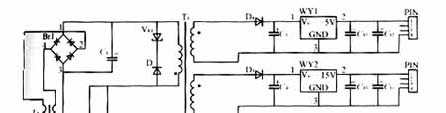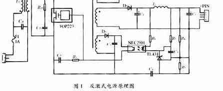 輸入為交流85~200V,經功率二極管整流橋變為直流,作為DC/DC反激變換器的輸入,輸出為三組直流:5V、15V、20V,另外還有一輔助電源5V,用來給光耦NEC2501供電。控制電路為反饋控制,開關選用TOPSwitch電源芯片(TOP223)。TOPSwitch為三端離線式PWM電源集成控制器,它將PWM控制器與功率開關MOSFET合為一體,采用TO-220或8腳DIP封裝,除D、C2腳外,其余6腳連在一起作為S端。