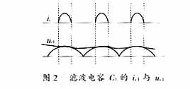 若線圈電感足夠大,則電流導通角可達到180°,電流近似正弦波,功率因數趨于1。但是,在實際應用中,如果電感值太大,那么其體積重量隨之變大,從而影響了電源的小型化,而且整流電壓隨著負載變化較大,因此,線圈L也不能太大。本電路中共模扼流圈L2可起到電感的作用,其等效電感為L,則可抑制電容電流的高次諧波。