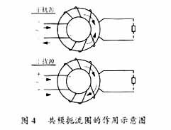 對開關電源二根進線而言,存在共模干擾(二根線上受干擾信號相對參考點大小、方向相同)和差模干擾(二根線上受干擾信號相對參考點大小相等、方向相反)。共模扼流圈如圖4所示。