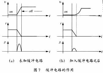 未加緩沖電路和加入緩沖電路之后開關管電壓Ut和電流i及功耗Pt的波形如圖7所示。由圖7可知,加RC緩沖電路后,開關電壓上升速率減慢,變小,噪聲減弱,抑制了EMI。另外,開關功耗變小,使管子不致因過流過熱而損壞。緩沖電路中的R21是在開關開通,電容C21放電時起到限流作用,避免對管子的沖擊。