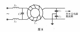 為更好抑制EMI對電路的一些改進本電路中主要的EMI是電源噪聲對電網的干擾。可將原來的共模扼流圈L2與電容C10、C1組成的濾波電路,改善為如圖8所示電路,則L1、L2、C1可除去差模干擾,L3、C2、C3可除去共模干擾。L1、L2的磁芯為不易飽和的材質。C1可選陶瓷電容,耐壓必須考慮輸入電壓的最大可能值,通常選用0.22~0.47μF。L3是共模扼流圈。選定C=C2=C3,截止頻率f0,則可根據計算L3;選定C1,截止頻率f0,可計算出L1、L2。