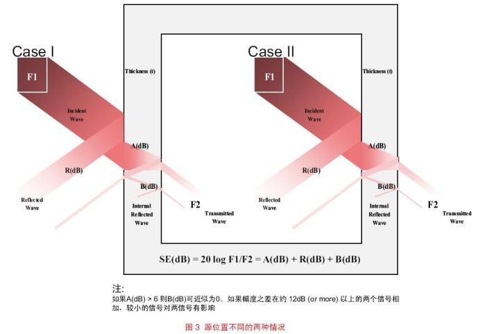 在這種情況下,之所以沒有將反射R() 當作一種損耗來考慮是因為被內部墻體反射(方向改變)的能量仍然處于殼體內部。盡管必須承認R() 不嚴格等于0,但其影響仍然非常小。這些殼體內部的反射可能會導致和產生干擾的信號不同相的衰減波。它們要么可能會對產生它們的電路的操作形成干擾,要么可能會和正常波疊加從而導致電磁場的增大。即使這些可能發生的事情都沒有發生,反射波還可以和正常波一起通過縫隙同時泄漏出殼體,從而導致整個場強的增大。當殼體的尺寸增大到駐波可以存在的時候,諧振放大也