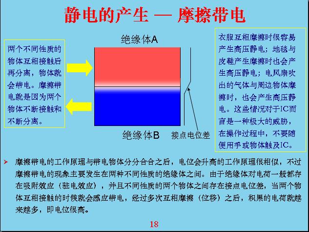 舉一個具體的例子,比如說我現(xiàn)在這個人站在地上,我是光著腳,地板是導(dǎo)電的,這個椅子是絕緣的,我從地面一站到椅子上就相當(dāng)于我?guī)щ娏恕槭裁矗恳驗槲以瓉硎菢O化帶電,上面帶負電,下面帶正電,我站在地上下面就變成零,上面變成了-100v,站上去的時候相對來說我就變成帶電的人。所以,很多在半導(dǎo)體車間或者和集成電路接觸、打交道的人,不要隨隨便便用人摸集成電路,因為你這個人不知不覺就帶電了,你從門外面走進房子里很可能就帶電了,在上樓梯或者地板鋪有一層絕緣的東西,在絕緣以外的時候你不帶電,站上去就帶電了,因為上面有電層。還有空調(diào)的風(fēng)吹出來的空氣會和你身體上面的衣服進行摩擦、感應(yīng),它容易帶電,用靜電筆來測,隨便碰衣服或頭發(fā),上面帶的電基本上都有300v左右,如果摩擦幾下大概就有4000-5000v,所以靜電感應(yīng)是相當(dāng)厲害的,很多模型電路在送到工廠的時候就是用盒子包裝,因為盒子是導(dǎo)電的,如果用電表去量它好像沒有電阻,電阻是無窮大,其實它是導(dǎo)電的,相對來說電導(dǎo)率很低,也就是電阻很大。