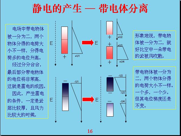 如果一個帶電體之間分開的話,就有一個大的電位,絕對值相對來說也會偏高,這就是因為云受到極化帶電以后,分分離離又合合,使得云帶的電越來越高。帶電越來越高以后能量也越來越高,兩個碰在一起就會放電,就會產(chǎn)生雷電,雷電就是這樣產(chǎn)生的。雷電就是因為在地球的外圍空間里面存在電場,云又受到風(fēng)的作用,才會互相分離又互相組合,使帶電物體的電位越來越高,最后形成放電。    還有摩擦帶電也是由于電場產(chǎn)生的,因為兩種不同的物體有接點電位差,電磁也是靠兩種不同物體產(chǎn)生的電位差,最后產(chǎn)生化學(xué)作用,之前電場沒有發(fā)生化學(xué)作用的時候,兩個物體靠在一起就會產(chǎn)生電場作用,就已經(jīng)有了電位差,產(chǎn)生摩擦的話和雷電產(chǎn)生的過程一樣,來回分離又組合,最后產(chǎn)生一個高的電場。