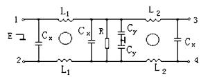 圖2為高性能的EMI濾波器。其中,E表示共模信號輸入端。圖2中網絡的共模等效電路如圖3(a)所示,差模等效電路如圖3(b)所示。圖3(b)中Le1、Le2、Cxi,i=1,2,3,分別表示等效電感和電容。