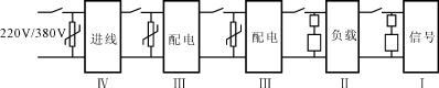 從圖1可以看出,在220V/380V線路中的每一區域,都應該在其前面并聯氧化鋅壓敏電阻器或過電壓保護器,雷電感應過電壓能量將通過逐級的防雷器件吸收和釋放到大地中,達到保護線路和設備免受雷電破壞的目的;雖然應用于Ⅳ、Ⅲ區域的過電壓保護器具有自身劣化斷開電源的功能,但考慮到不同的接地狀況,還應與過電壓保護器串聯合適的熔斷器或空氣開關.