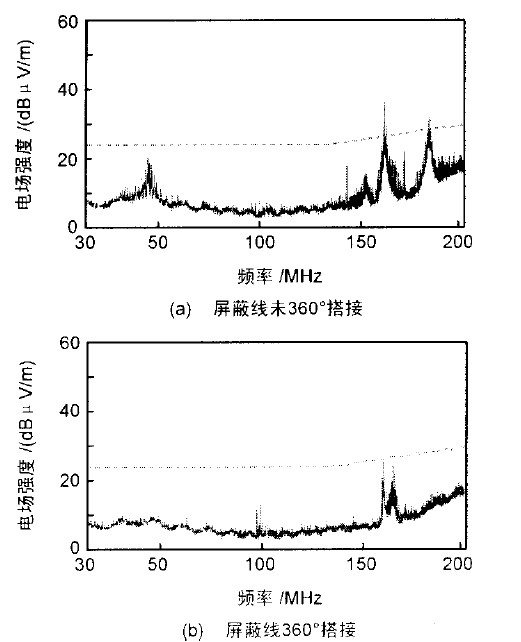 減小空間輻射測試曲線如圖4 所示。圖4(a)是一臺外接屏蔽電纜的設備的測試曲線,電纜與接口連接器相連的地方都是將屏蔽層擰成一條小辮(又稱Pigtail),然后固定到連接器的螺釘上。屏蔽電纜能控制共模輻射是因為共模電流提供了一個低阻抗通路,使共模電流通過屏蔽層流回共模電壓源。電纜屏蔽層提供的共模電流通路的阻抗由電纜本身的阻抗及電纜與金屬機箱之間的搭接阻抗2 部分組成。因為電纜與金屬機箱之間的搭接阻抗(Pigtail的阻抗)較大,這就使得屏蔽層上形成了一個較大的共模電壓,在該電壓的驅動下,電纜屏蔽層上會產生共模電流,因而屏蔽層變成了天線向外輻射。將Pigtail連接改成360 壓接在連接器的金屬外殼上,保證低阻抗搭接,測試結果如圖4(b)所示。