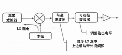 為了解決信號發(fā)生器的需求,一個上變頻器將信號從1.1GHz~2.2GHz頻帶變換至4.9GHz~6GHz頻帶。表2列出了上變頻器的兩種技術(shù)。同樣,我們選擇基本混頻方案。上變頻器的方框圖基本上和下變頻器類似,只是作些變更以適應(yīng)輸入頻率低于輸出頻率(圖2)。同樣可以用2dB衰減器來改善混頻器每個端口的匹配度。用相同的混頻器和開關(guān)來提供變頻或直通性能。上邊帶由輸出級的帶通濾波器除去,最終的輸出電平用可程控衰減器進(jìn)行高速調(diào)整,為了便于觀察,針對頻譜倒置的校正是必不可少的。