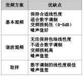 表1列舉了3種主要的下變頻技術(shù),同時指出了各自優(yōu)缺點(diǎn)。基本混頻似乎是最佳方案。在4.6GHz~6GHz下變頻場合,使用固定頻率的本振,1.1GHz輸出信號的頻帶與輸入信號頻帶相同,因此稱為區(qū)變頻。