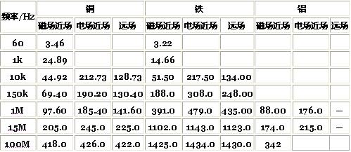 場源距離不同材料的屏蔽體(厚度0.254mm)30cm遠的屏蔽效能(dB)計算結果見表1。表1中近場和遠場的分界點為λ/2π,λ為電磁場的波長。