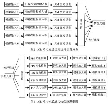 EMC測試低頻光導傳輸設備1MHz模擬光通道包含6個低頻模擬信號光傳輸通道,6個低頻傳輸通道的信號頻帶為100Hz~1MHz,采用1550nm單縱模DFB激光器和AM直接強度調制技術,通過6芯單模光纖傳輸,原理框圖如圖2、圖3所示。