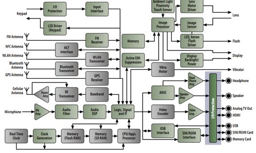圖7:智能手機(jī)框圖及需要保護(hù)的I/O接口(見右下側(cè)淺藍(lán)色背景區(qū)域)