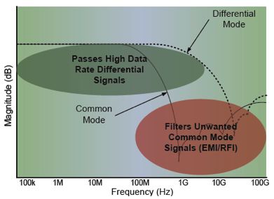 第二類EMI濾波器適用于高速串行接口,功能超過了典型低通濾波器。這類接口是具有固有噪聲抑制的差分信號路徑,但不會完全免疫來自外部源的共模噪聲,或阻止來自輻射到系統(tǒng)其他部分的接口信號。