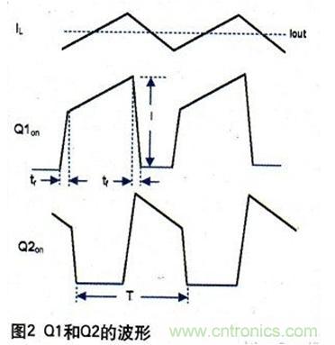 當(dāng)Q1關(guān)斷、Q2導(dǎo)通時(shí),就形成了第二個(gè)回路。之后存儲在L1內(nèi)的能量流經(jīng)輸出電容器和Q2,如圖5所示。這些回路面積控制對于降低電磁干擾是很重要的,在PCB走線布線時(shí)就要預(yù)先考慮清器件的布局問題。當(dāng)然,回路面積能做到多小也是有實(shí)際限制的。