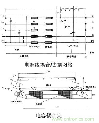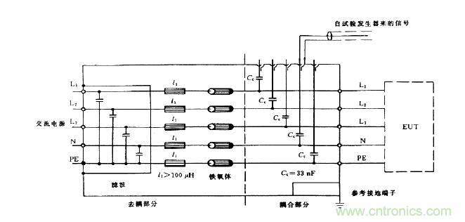 作為佐證,我們利用電源線耦合/去耦網(wǎng)絡(luò)來(lái)加以說(shuō)明:在圖中可以看到從試驗(yàn)發(fā)生器來(lái)的信號(hào)電纜芯線通過(guò)可供選擇的耦合電容加到相應(yīng)的電源線(L1、L2、L3、N及PE)上,信號(hào)電纜的屏蔽層則和耦合/去耦網(wǎng)絡(luò)的機(jī)殼相連,機(jī)殼則接到參考接地端子上。這就表明脈沖群干擾實(shí)際上是加在電源線與參考地之間,因此加在電源線上的干擾是共模干擾。