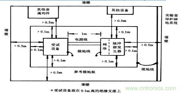① 試驗應在試驗室中央進行,除位于試品及試驗儀器下方的參考接地板外,它們與其他所有導電性結(jié)構(gòu)(例如屏蔽室里的墻壁和實驗室里的其他有金屬結(jié)構(gòu)的試驗儀器和設(shè)備)之間的最小距離為0.5m,以避免脈沖群干擾中輻射成分的反射,再與原先的干擾疊加,對試驗結(jié)果產(chǎn)生影響。