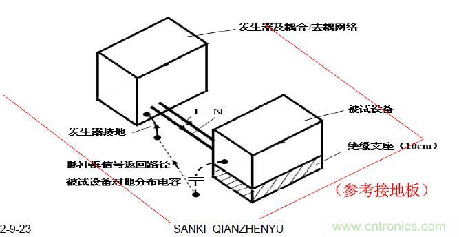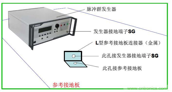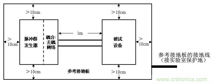 ③ 試驗儀器(包括脈沖群發(fā)生器和耦合/去耦網(wǎng)絡(luò))放在參考接地板上。試驗儀器用盡可能粗短的接地電纜與參考接地板連接,并要求在連接處的阻抗盡可能地小。