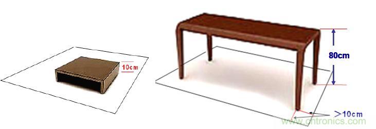 ④ 落地的試品要用0.1±0.01m的絕緣座隔開后放在參考接地板上。對于臺式試品,應放置在離參考接地板高度為0.8±0.08m的木頭臺子上,試品(或試驗臺子)距參考接地板邊緣的最小尺寸滿足項①(0.1m)的規(guī)定。