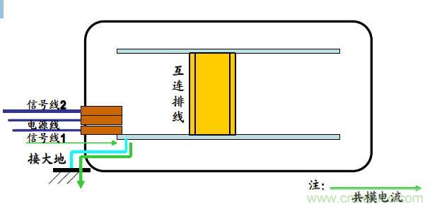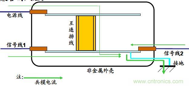 結構和接地也是抑制脈沖群干擾的很重要的方面。圖示為一個非金屬外殼的電子設備,首先電源線遠離接地點,接地路徑較長,接地效果大大降低。其次,信號線1遠離接地點,導致干擾脈沖施加在電源線和信號線1上時,脈沖群的共模干擾電流要經互連線和下面的線路板,最終經接地端子入地。由于互連線的阻抗較大,而且接地路徑又長(接地阻抗也大),大大增加了電磁兼容的風險。