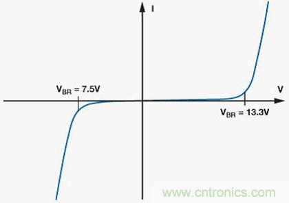 重要的是要確保TVS的擊穿電壓在受保護引腳的正常工作范圍之外。CDSOT23-SM712的獨有特性是具有+13.3 V和–7.5 V的非對稱擊穿電壓,與+12 V至–7 V的收發器共模范圍相匹配,從而提供最佳保護,同時最大程度減小對ADM3485E RS-485收發器的過壓應力。