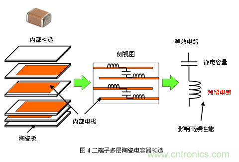 目前所使用的電容器多為片狀多層陶瓷電容器。圖4為二端子片狀多層電容器的結(jié)構(gòu)概念 圖。其結(jié)構(gòu)表現(xiàn)為,夾著電介質(zhì)薄片,分別與兩側(cè)外部電極連接的內(nèi)部電極交錯(cuò)層疊。由于其為片狀結(jié)構(gòu),且無(wú)引線,因此該部分沒(méi)有殘留電感。然而,由于其內(nèi)部 還存在微量電感,因此在較高頻率下將導(dǎo)致性能下降。