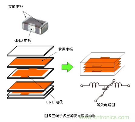 如圖5所示,片狀三端子電容器雖名為三端,但實(shí)為四端結(jié)構(gòu)。這是因?yàn)椋m然四端設(shè)計(jì)可減少接地端電感,但電氣特性方面,無(wú)論哪個(gè)端子都具備相同電位。而引線型三端子電容器原本就為三端結(jié)構(gòu),因此貼片化后仍被稱為"三端"。[page]