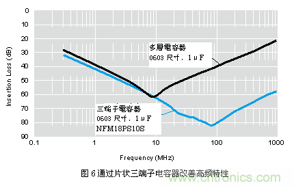 圖6中對(duì)片狀三端子電容器與片狀二端子多層電容器的插入損耗特性進(jìn)行了比較。兩種元件的靜電容量相同,因此在低頻范圍內(nèi)特性相同。但是二端子電容 器在頻率超過(guò)10MHz后性能便開始下降,而三端子電容器則在超過(guò)100MHz后才會(huì)出現(xiàn)性能下降。由于片狀三端子電容器在一定程度的高頻范圍內(nèi)都不會(huì)出 現(xiàn)性能下降,因此它適用于需要去除高頻干擾的情況。