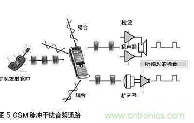 當手機與基站通訊,或兩個手機彼此接近時,發射脈沖通過擴音器,揚聲器,或頭戴式耳機線傳人音頻通路。見圖5。結果是音頻質量大幅降低。