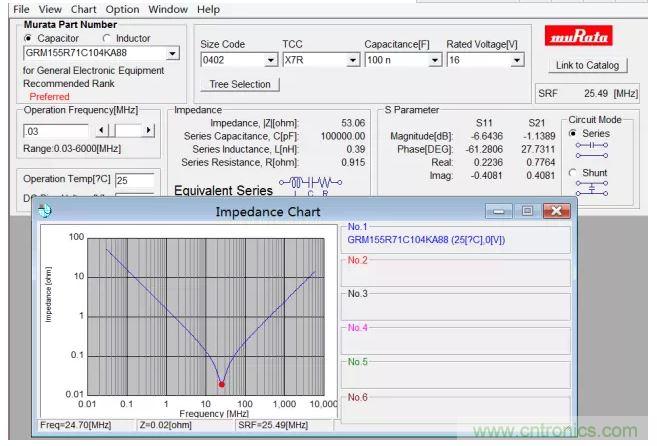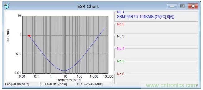 平常對ESR的關注不多,其實ESR也是非常關鍵的一個參數。不少人對ESR會有一些誤解。首先,ESR不是一個常數,是隨著頻率而變化的。圖1的Murata工具里面看到的串聯電阻(Series Resistance )值,不是我們常規理解的諧振頻率點的ESR,后面的等效電路仿真的時候需要注意這個細節。圖2是這個電容的ESR隨頻率變化的曲線。諧振頻率點的ESR值,決定了電容阻抗曲線的最低點。這個值在電容設計的時候也非常重要,一般來說,小尺寸封裝的小電容,諧振頻率點的ESR值一般較大。