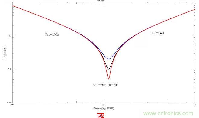 接著,我們來看看電容的并聯,先暫時忽略安裝電感,后面再單獨介紹安裝電感的設計細節。同種類電容的并聯如圖3所示,諧振頻率點不變,但是諧振頻率處的ESR會形成電阻并聯。可以認為同一種類電容加的數量越多,電容并聯之后,諧振頻率點的阻抗越低。