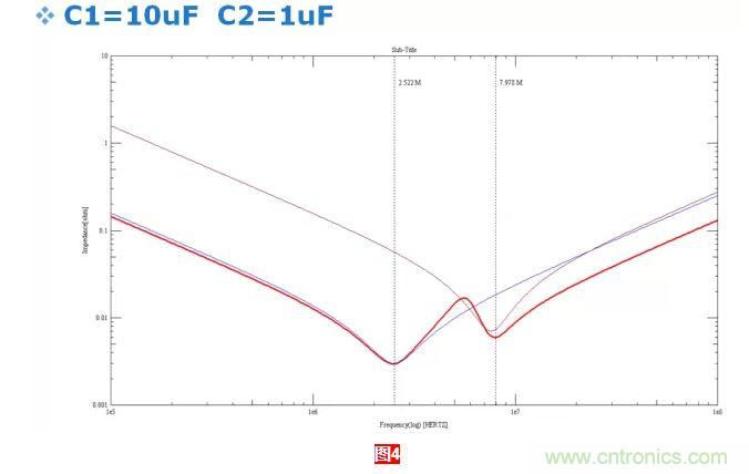 不同種類電容的并聯如圖4所示,兩種電容并聯,會出現兩個諧振頻率點。同時還會出現一個反諧振頻率點,這個反諧振頻率是電容設計的難點之一。