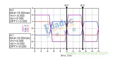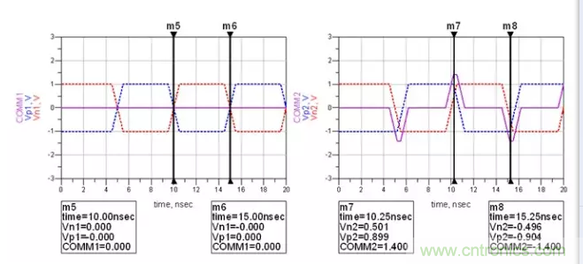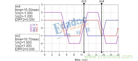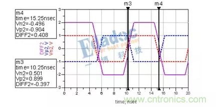 可以看到,兩次經過零軸的時間由之前的5ns變成了4.8ns。或者說,N與P的長度差,引起了0.04UI的抖動。這時候,串行的Clock recovery該花點心思才能將其時鐘解出來了。而且在進行時鐘與數(shù)據(jù)對位的時候,是對在0V這個階梯的左邊還是對在右邊呢?這又會引起時序問題的出現(xiàn)。