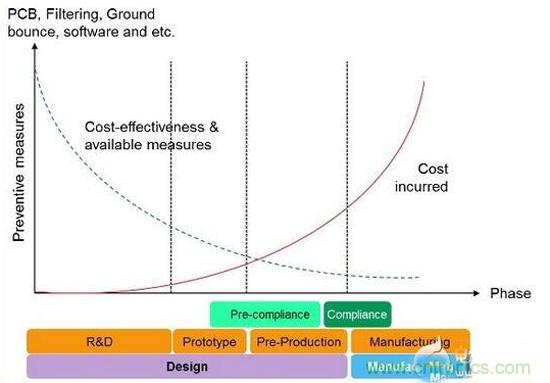 圖1:當產品在開發階段一步步推進時,變更所承擔的潛在成本上升,清除EMI問題的可用措施逐步受到限制。