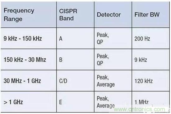 表1:CISPR測試要求根據不同頻率范圍而有所變化,并影響頻率分辨率。