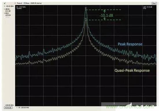 好消息是,峰值和準峰值掃描對預先一致性測試來說仍然是有用的。圖4給出了一個峰值和準峰值檢測的例子。圖中顯示了峰值檢測和準峰值檢測中都能看到的脈寬為8μs、重復率為10ms的信號。結果準峰值的檢測結果比峰值低了10.1dB。