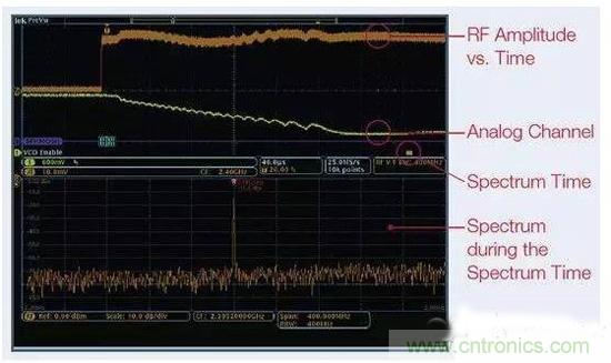 圖6:這張圖顯示了MDO提供的時間關聯觀察功能,圖中顯示了射頻幅度與時間的關系軌跡。