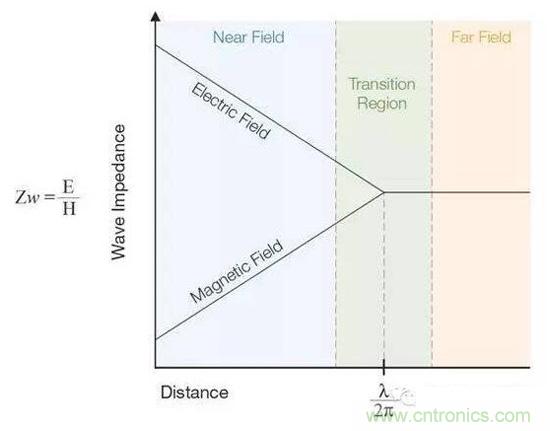 圖7:這張圖顯示了近場和遠場中的波阻行為以及兩者之間的過渡區。近場測量可用于EMI排查。