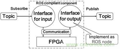 Rosbridge為ROS與FPGA的聯(lián)通提供了一種溝通機(jī)制,但是在這種機(jī)制中,ROS Node并不能運(yùn)行在FPGA上,而且通過JSON API的連接機(jī)制也帶來了一定的性能損耗。為了讓FPGA與ROS更好的耦合,最近日本的研究人員提出了ROS-Compliant FPGA的設(shè)計(jì),讓ROS Node可以直接運(yùn)行在FPGA上。如圖10所示,在這個(gè)設(shè)計(jì)中,F(xiàn)PGA了實(shí)現(xiàn)一個(gè)輸入的接口,這個(gè)接口可以直接訂閱ROS的topic,使數(shù)據(jù)可以無縫連接流入FPGA計(jì)算單元中。另外,F(xiàn)PGA上也實(shí)現(xiàn)了一個(gè)輸出接口, 讓FPGA上的ROS Node可以直接發(fā)表數(shù)據(jù),讓訂閱這個(gè)topic的其他ROS Node可以直接使用FPGA產(chǎn)出的數(shù)據(jù)。在這個(gè)設(shè)計(jì)中,開發(fā)者只要把自己開發(fā)的FPGA計(jì)算器插入到ROS-compliant的FPGA框架中,便可以無縫連接其他ROS Node。