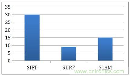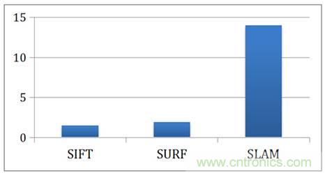為了讓讀者了解FPGA對特征提取與位置追蹤的加速以及節(jié)能,下面我們關(guān)注加州大學(xué)洛杉磯分校的一個(gè)關(guān)于在FPGA上加速特征提取與SLAM算法的研究。圖5展示了FPGA相對CPU在執(zhí)行SIFT feature-matching、SURF feature-matching以及SLAM算法的加速比。使用FPGA后,SIFT與SURF的feature-matching分別取得了30倍與9倍的加速,而SLAM的算法也取得了15倍的加速比。假設(shè)照片以30FPS的速度進(jìn)入計(jì)算器,那么感知與定位的算法需要在33毫秒內(nèi)完成對一張圖片的處理,也就是說在33毫秒內(nèi)做完一次特征提取與SLAM計(jì)算,這對CPU會造成很大的壓力。用了FPGA以后,整個(gè)處理流程提速了10倍以上,讓高幀率的數(shù)據(jù)處理變得可能。