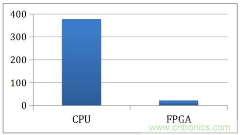 為了讓讀者了解FPGA對深度學(xué)習(xí)的加速以及節(jié)能,我們下面關(guān)注北京大學(xué)與加州大學(xué)的一個(gè)關(guān)于FPGA加速CNN算法的合作研究。圖7展示了FPGA與CPU在執(zhí)行CNN時(shí)的耗時(shí)對比。在運(yùn)行一次迭代時(shí),使用CPU耗時(shí)375毫秒,而使用FPGA只耗時(shí)21毫秒,取得了18倍左右的加速比。假設(shè)如果這個(gè)CNN運(yùn)算是有實(shí)時(shí)要求,比如需要跟上相機(jī)幀率(33毫秒/幀),那么CPU就不可以達(dá)到計(jì)算要求,但是通過FPGA加速后,CNN計(jì)算就可以跟上相機(jī)幀率,對每一幀進(jìn)行分析。