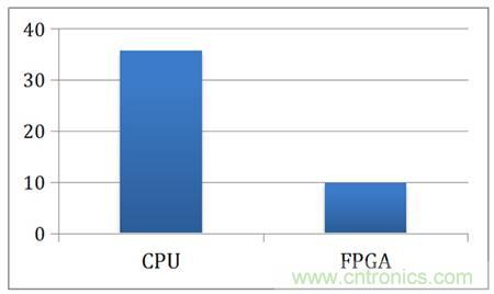 為了讓讀者對FPGA加速有更好的了解,我們總結(jié)了微軟研究院2010年對BLAS算法的FPGA加速研究。BLAS是矩陣運(yùn)算的底層庫,被廣泛運(yùn)用到高性能計(jì)算、機(jī)器學(xué)習(xí)等領(lǐng)域。在這個(gè)研究中,微軟的研究人員分析了CPU、GPU以及FPGA對BLAS的加速以及能耗。圖2對比了FPGA以及CPU、GPU執(zhí)行GaxPy算法每次迭代的時(shí)間,相對于CPU,GPU與FPGA都達(dá)到了60%的加速。圖中顯示的是小矩陣運(yùn)算,隨著矩陣的增大,GPU與FPGA相對與CPU的加速比會越來越明顯。