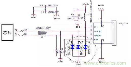 D1、D2、D3選用TVS,TVS反向關斷電壓為5V。TVS管的結電容對信號傳輸頻率有一定的影響,usb2.0的TVS結電容小于5pF;