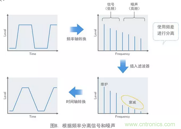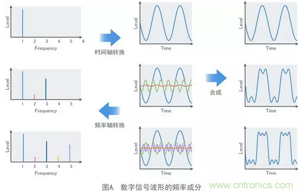 在我學(xué)生時(shí)代碰到的噪聲中,計(jì)算機(jī)的時(shí)鐘頻率約為4MHz。但是,例如在日本,用于調(diào)頻廣播的頻段為76MHz或更高。噪聲源的時(shí)鐘頻率不會(huì)與廣播頻率重疊。那問(wèn)題為什么會(huì)出現(xiàn)呢?數(shù)字信號(hào)是由基波正弦波和其整數(shù)倍的諧波組成的方波,如圖A所示。方波的上升越急劇,其包含的高次諧波分量越高。這意味著實(shí)際的數(shù)字信號(hào)具有與調(diào)頻廣播頻帶重疊的諧波分量,從而導(dǎo)致調(diào)頻收音機(jī)的聲音中產(chǎn)生噪聲。